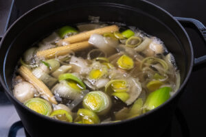 Ingrediënten: 50g gember, 5 tenen look, 1 stuk prei, 0,5 ajuin, 2l kippenbouillon, resterende dashibouillon (zie boven), katsuobushi, kombu, enkele gedroogde shiitakes, shiodare