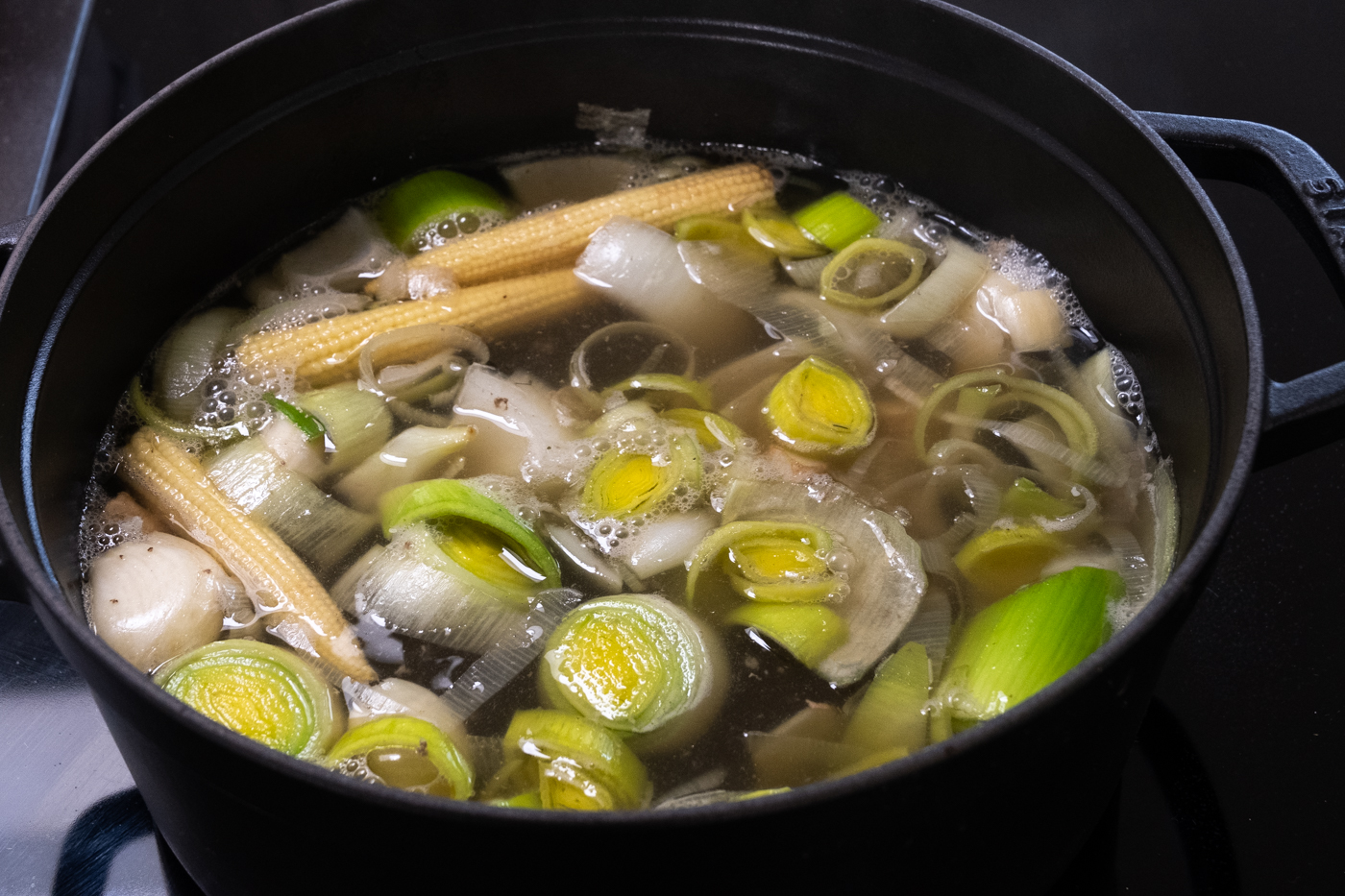 Op dag 2 maakte ik ook de soep. Zoals gezegd gebruik je hiervoor best homemade of kwalitatieve kant-en-klare bouillon. Varkens- of runderbouillon trekken, dat is ook geen evidentie. Ik had nog zelf getrokken kippenbouillon—van zelf opgekweekte en zelf geslachte kippen (extra hipsterpunten)—liggen en gebruikte die als vertrekpunt.