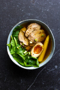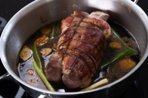 Nog op dag twee maakte ik het bekende donkere ei (ajitsuke tamago) en de chashu nibuta of traaggegaard varkensvlees . Voor het varkensvlees wordt vaak buikspek gebruikt. Ik koos echter voor schouder, omdat ik dat nog in de diepvries had. Voor de chashu-marinade bestaan ook weer tientallen recepten. Soms met mirin en sesamolie, soms zonder.