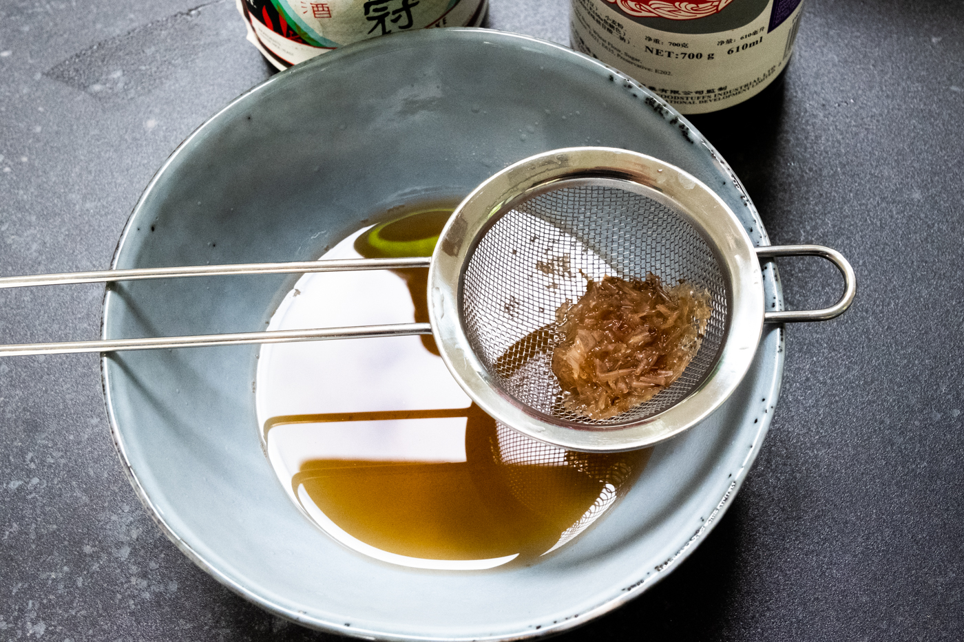 Op zich is het eenvoudig: aromaten toevoegen, langzaam laten sudderen en dashi toevoegen. Net voor het einde voeg je nog extra smaakmakers zoals bonito flakes en kombu toe. Net voor het serveren breng je die op smaak met de tare. Die tare is zeer geconcentreerd, dus beetje per beetje.