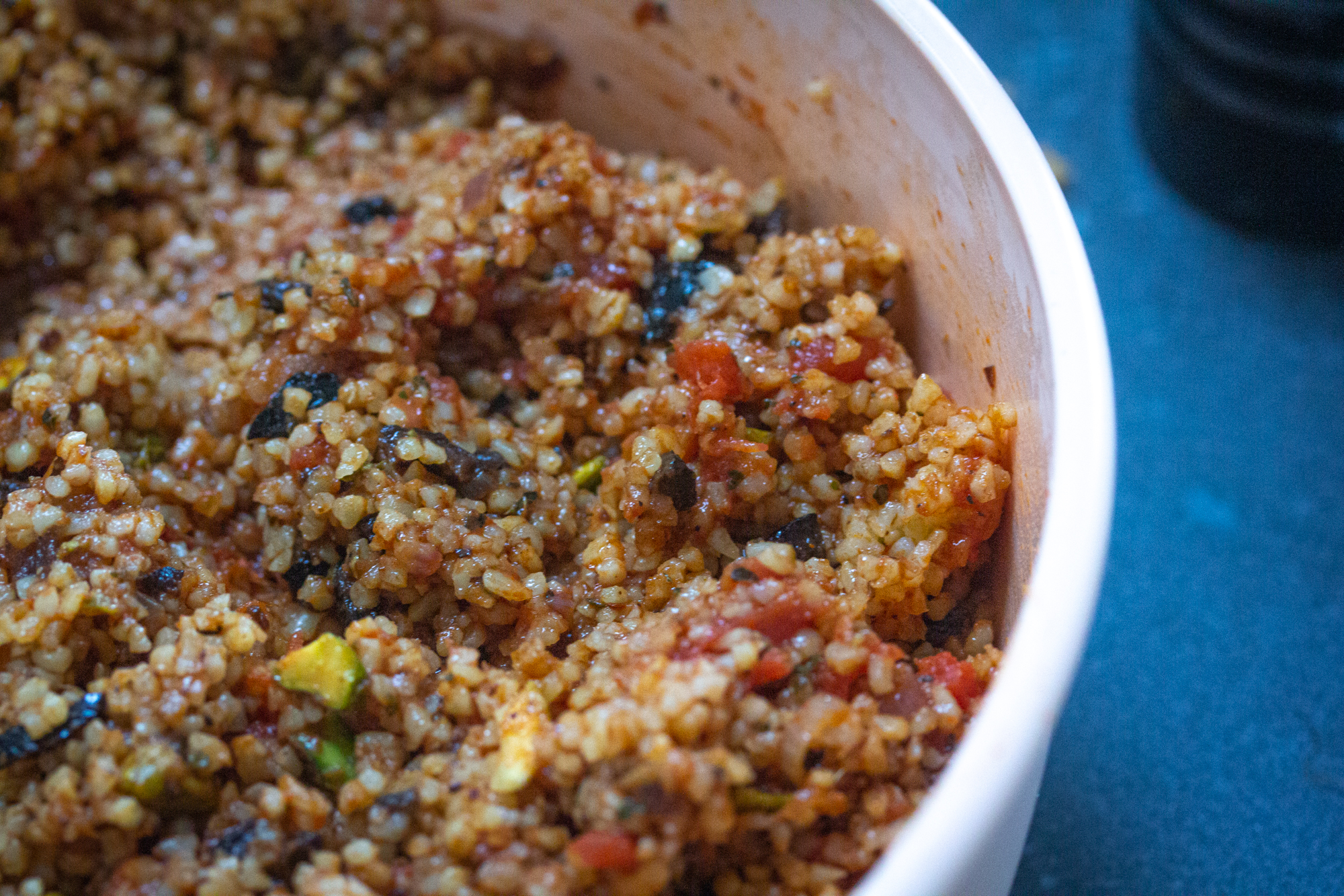 Meng de bulgur met de pistachenoten, dadels, kruiden en olijven.