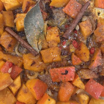 Dat was ook de uitdaging die ik aanging om een heerlijke herfstige tajine te maken. Ik vond een oud recept van Ottolenghi, uit de beginjaren dat hij schreef voor The Guardian: ‘sweet and sour tajine’. Een eenvoudige, vegetarische tajine met pompoen, ingelegde citroen en véél specerijen. Ik voegde ook nog kippendijen en kippenbouillon toe. Uiteraard kan je die gewoon weglaten (en vegetarische bouillon gebruiken) als je de vegetarische versie wilt. Het resultaat was overheerlijk, ik beveel je warm aan om ‘m deze herfst ook op je menu te zetten!