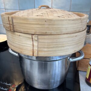* Om te stomen gebruikte ik zo’n typische pastakoker met vergiet in, dat lukt perfect. Of gebruik een grote bamboe stoommand die je op een pot kokend water zet.