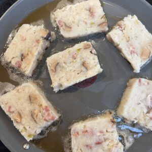 Voor een keertje is de ingrediëntenlijst niet ellenlang. De bereiding vraagt wat meer tijd (weken – stomen – afkoelen – opbakken) maar is eigenlijk niet heel moeilijk, fijn! Heerlijk hartig van smaak, zacht van textuur met een zalig krokant korstje. Het ontdekken waard dus!